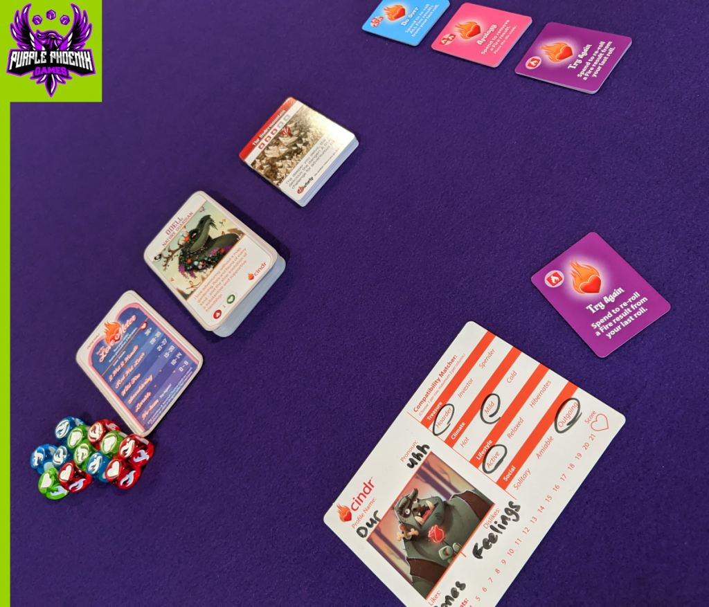 Finally! A game to simulate dating dragons. I have been waiting for this theme all my life and it’s now a reality!! Well, okay, I have never really considered dating a dragon. But I know I would be signing up for a service app like Cindr to find my true dragon mate FO SHO if it were real. So how does a card game dragon sim play?