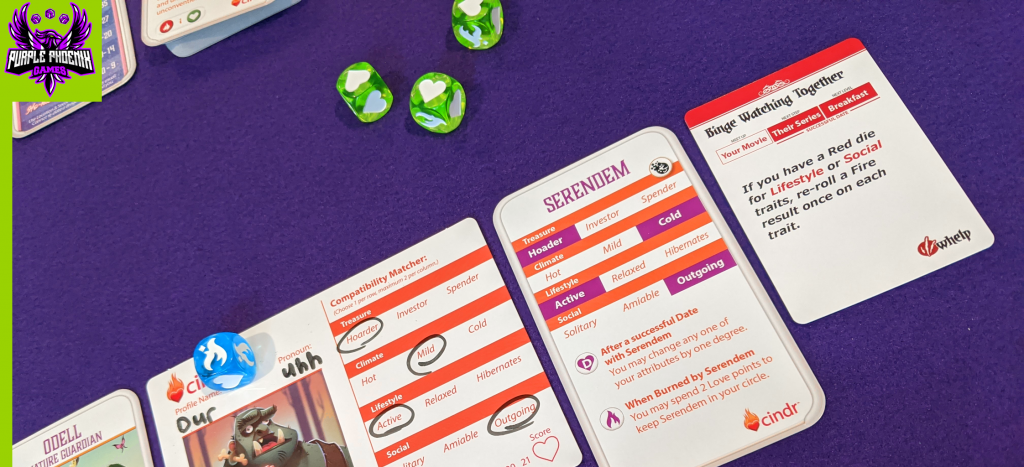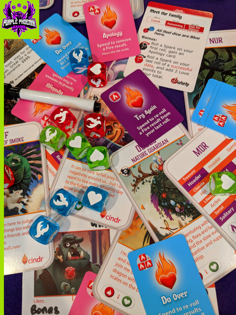Choosing a Dragon to Date consists of reading the profile on the top of the deck and deciding whether to date or not. If not, swipe the profile into The Dating Pool below the deck. Players may swipe twice for free, and pay for additional swipes. After a dragon has been chosen, players will Assemble the Dice Pool by flipping the profile card and comparing with the stats they had made for their character at the beginning of the game. For each match players will receive a green die. For each value one space away a blue die, and for two spaces away a red die. Each die color has a different value of faces, but all have hearts and fires. Next the player(s) will Draw a Location Card from the top of the deck, read the front, then flip to the back. The back of the card will list any die up/downgrades and bonuses that may activate at different times during the date. Checking Dragon Powers & Location Bonuses will happen next and are self-explanatory.