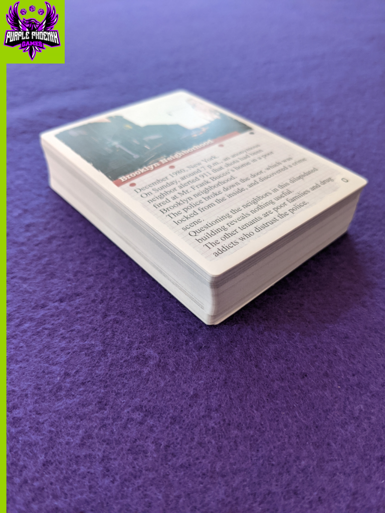 The game is mostly free-form: there are no real “turns” to be taken. At any time the player may flip over a card to zoom in and gain some intelligence into a portion of the crime scene, or a suspect, or an item, or other things. By flipping over the correct cards and following the correct leads, the player can put together the culprit, motive, weapon (if that’s a thing in the scenario), accomplices, etc. One card may lead the player to uncover other cards, and can really start to unfold the story being given. However, spending too much time barking up the wrong tree can cost the player points at the end of the game - extra points are awarded to players who refrain from flipping every card.