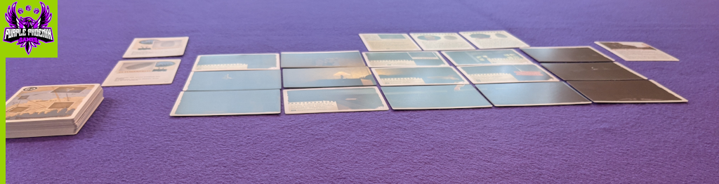 To setup, place the deck of cards on the table, like the photo below, with the card numbered 0 on top. This card will walk the player through the setting and instruct them how to construct the crime scene. That’s it.