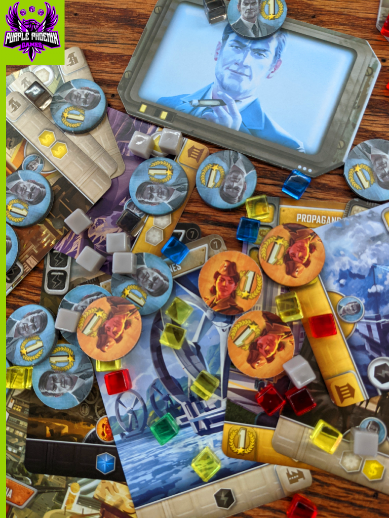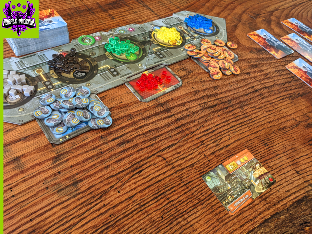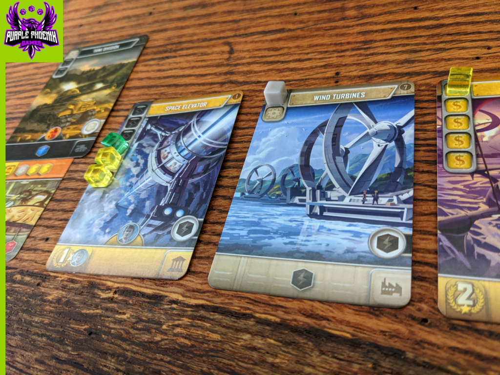 Cards placed in the Construction Area require resources to be earned and placed on them in order to complete its build process. Each round the player will receive resources based on which cards have been built and placed above their starting civ card. Some cards, once completely built, will also offer more VP at game end, or supply a VP modifier.