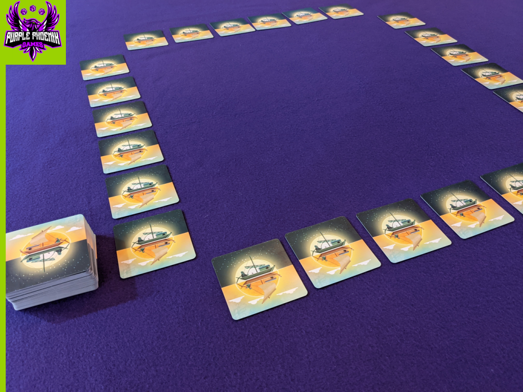 To setup the standard game, place all the border cards around a 6×6 grid, as in the photo below. Shuffle the appropriate number of Start and Finish cards into the deck of Island cards and place that beside the grid. Draw a hand of five cards and the game may begin. Setup is similar to the multiplayer setup, with a few changes. Once the hand of cards has been drawn, the game may begin! It is the solo player’s goal to build the sea of island cards, and place the Start and Finish cards before they run out of cards to be legally played.