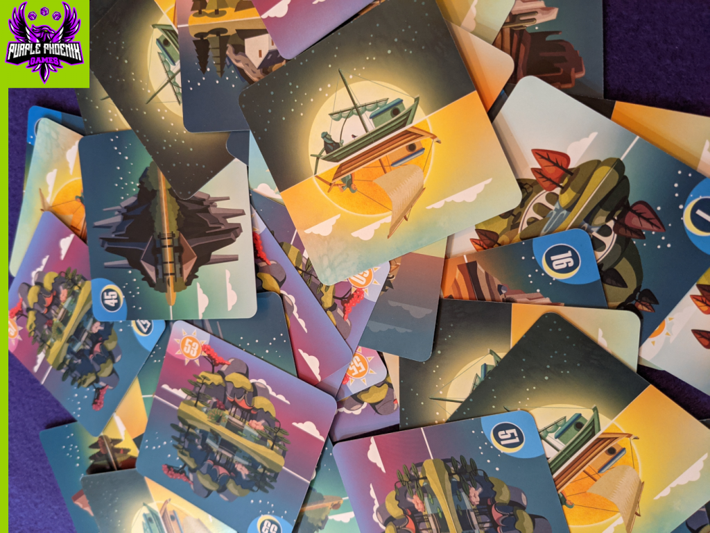 Components. This game is a bunch of square cards in a cubic box. Now, while that doesn’t sound super exciting, the art on the cards certainly make up for the lack of component diversity. Each card is matte finished, which I prefer for cards with great art on them. And oh man, that art is something wonderful! I have always been a fan of Tristam Rossin’s art, and it is on full display here. The cards are, well, I guess I cannot find the correct word because they aren’t double-sided, but split on the horizontal, with a daytime scene on the “top” and a nighttime scene on the “bottom” (or vice-versa, however you feel). I have nothing but praise for the components here.