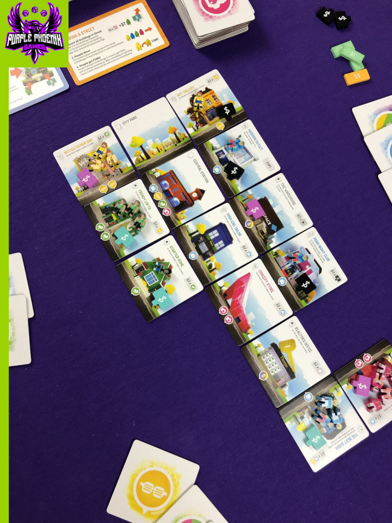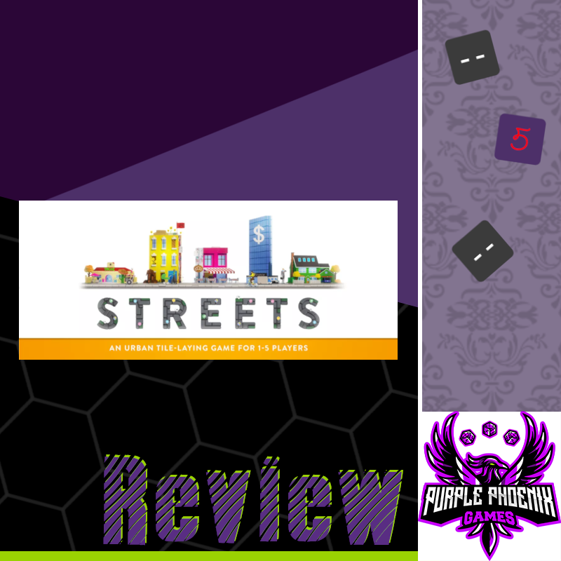 Streets is quickly making its way up my list, and could even break the Top 10 at some point. The gameplay is engaging, entertaining, and strategic. The components are high quality and just fun to play with. I liked Villagers a lot, but I am definitely a fangirl for Streets. It’s a neat game that goes beyond basic tile placement and set collection. It’s not one that I’ll necessarily pull out with newer gamers, but one that I hope will hit the table often with the regular group. If you’re in the market for something that is mechanically simple, yet strategically challenging, I would highly recommend giving Streets a shot. Purple Phoenix Games gives it constructive 5 / 6.