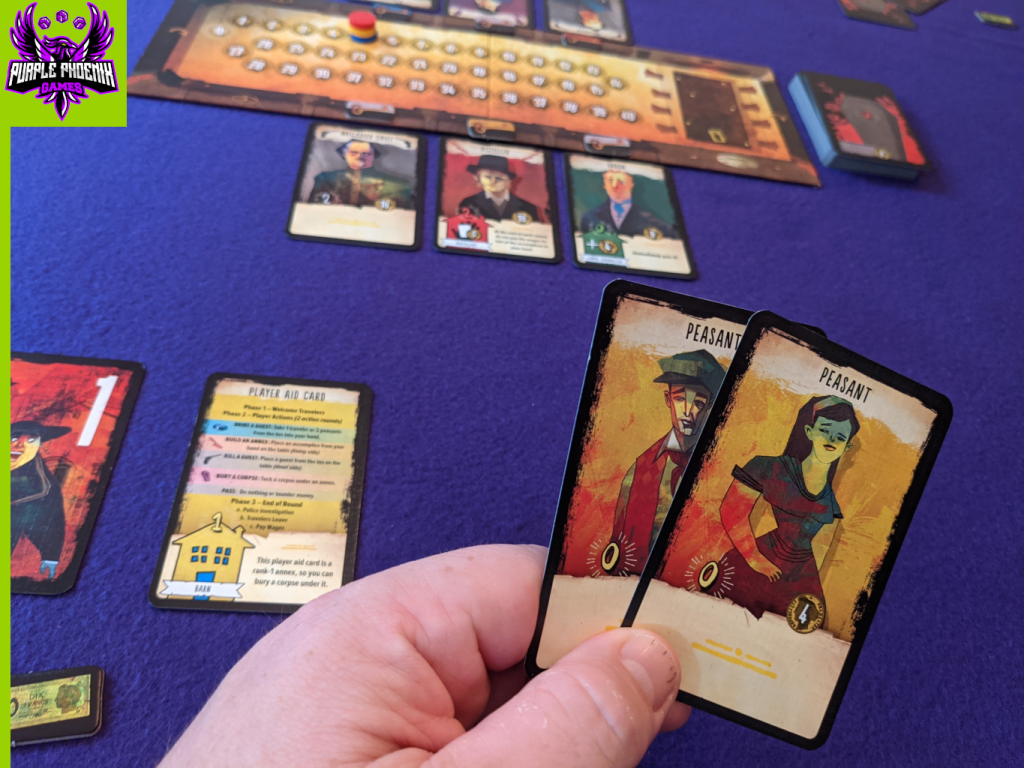 Once all players have taken their two actions, the End of Round is performed. Firstly, if any Travelers remain belonging to the Police type (signified by pistol icons on the top of the card), they will conduct an investigation, finding any unburied corpses. Should a corpse be found in this way, the owning player will need to pay 10f for the local undertaker to dispose of the body respectfully. This not only costs the player 10f, but also the amount of money that could have been gained if they had only buried them or dealt with the Police traveler prior. Next, the Travelers who remain all wake up feeling refreshed and leave the inn by being placed in the discard pile. Once the board has been cleared of all Travelers, accomplices must be paid their wages for their help. For each accomplice in hand, the players must pay 1f from the Wealth Track.