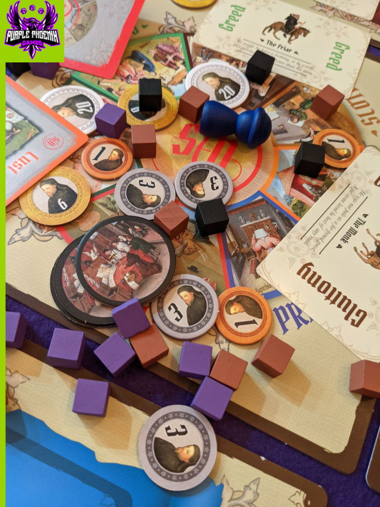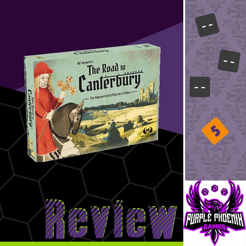 Now it’s no secret that I am a big fan of Dr. Seegert’s games, as I have previously reviewed Fantastiqa and Haven with very high ratings. So, I was not at all surprised that I would love this one as well. It offers so many great choices, looks great on the table, fills a unique void that was present in my collection, and can be played with various types of gamers, even though it is designed for two or three players total. Purple Phoenix Games gives this one an unapologetic 5 / 6. I don’t think it will break into my Top 10, but I certainly won’t rule it out quite yet. More plays with different types of gamers may change my mind on that statement, and I eagerly await my plateful of crow. So if you are like me in your gaming preferences, check out this version of The Road to Canterbury. Let me know how often you tend to grab Relics too, because I feel like I need to utilize them more, but it is so hard to pass up a Sin or Pardon. I Lust after them so very badly.