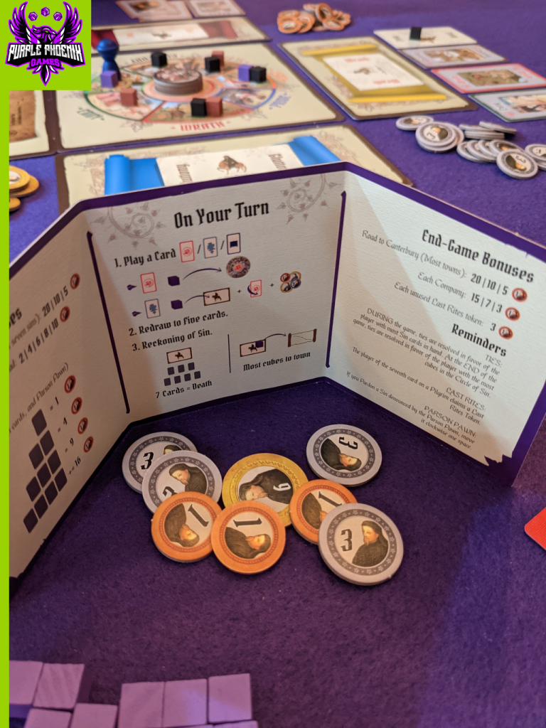 Play continues in this fashion of players taking turns through their three phases. The game ends when all the spaces on the map tile are filled with cubes. Bonus points are counted, coins are added, and the player with the most money/highest score is the winner! The best temptress and pardoner this side of Yorkshire!