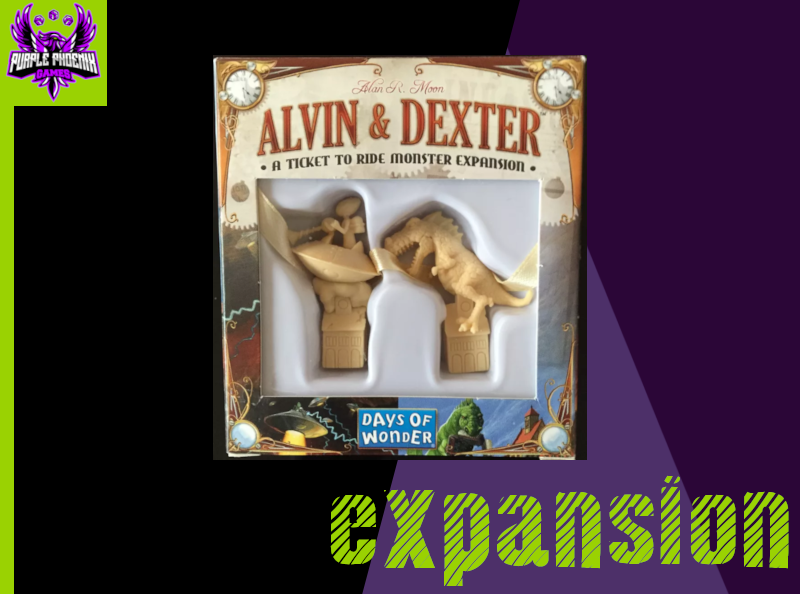This expansion adds two amazing little minis to the base game along with two decks of corresponding Alvin and Dexter cards and bonus cards for endgame scoring. Alvin and Dexter are both placed at setup and players may discard one or two of their train cards during their turn to draw an Alvin (the Alien) or Dexter (the Dinosaur) card from their respective stacks and move said monster three cities away if they discarded one train card or six cities away if they discarded two train cards. Any location with a monster mini on it is consider a City in Chaos and can therefore not accept new routes to or from it. The monsters simply block transportation in or out of the city. At the end of the game the players with the most amount of Alvin and Dexter cards will receive the Alvin and Dexter bonus cards respectively.
