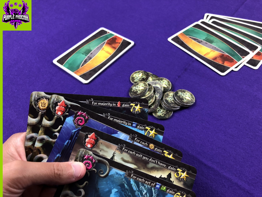 The next phase, Scoring, now begins. Players check their tableau and take a Madness token for each card with a Madness icon. The player with the most Madness this round can choose to gain an additional 4 VP or heal (discard) one Madness token. An important note - if at any time a player receives 9 or more Madness tokens, they immediately lose the game! So keep an eye on those cards, and know when to heal. Next, players will score the cards based on printed objectives - sets of suits, majority of a suit, etc. Points are tallied on the score pad. Finally, the Refresh phase gets you ready for the next round. Each player collects their tableau and selects one card to keep for the next round, and another card to discard from the game. Players simultaneously reveal their kept card and it starts the round already in their tableau. Players will draw 2 new cards to total 5 in hand, and the next round is ready to begin. Play ends either if a player has 9 or more Madness, or after a total of 3 rounds. After the 3rd and final round, all points are added up and the player with the highest score wins.