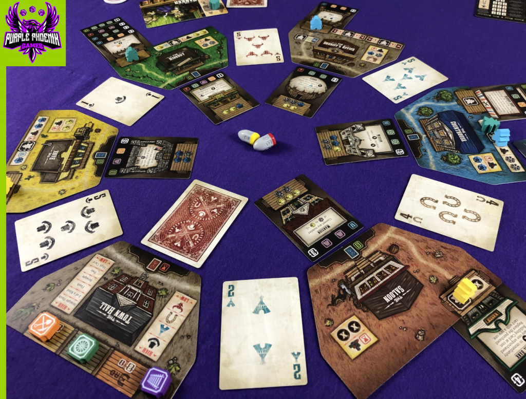 To start this phase, all players will compare their three-card Poker hands using the 2 Poker cards adjacent to the Town Hall. The player with the best hand will act first in this phase, followed by the next best hand, and so on. The first player may now choose to buy a Building card from any Location on which they have a Posse token. Pay the requisite amount of Influence to purchase a Building, and add it to the Porch Slot on your color-corresponding Location Mat. The power granted by this Building card is now available for use in future rounds. Once all players have had the option to purchase a Building, the player with the best hand will advance one of the Industry Tokens at Town Hall. The placements of Industry Tokens will affect end-game scoring, so keep that in mind as the game progresses. When all steps of the Buy phase are performed, the round now ends. Players collect all their Posse tokens back to their boss cards, all Poker cards are collected and re-shuffled, new Building cards are dealt to Locations from which they were purchased this round, and the Dealer token is passed to the next clockwise player. If a player did not buy a Building at all during the round, they have gained the Third Posse Benefit for the coming round - granting them an additional Posse token to place during phase 2. Otherwise, all players will only ever have 2 Posse tokens to place.