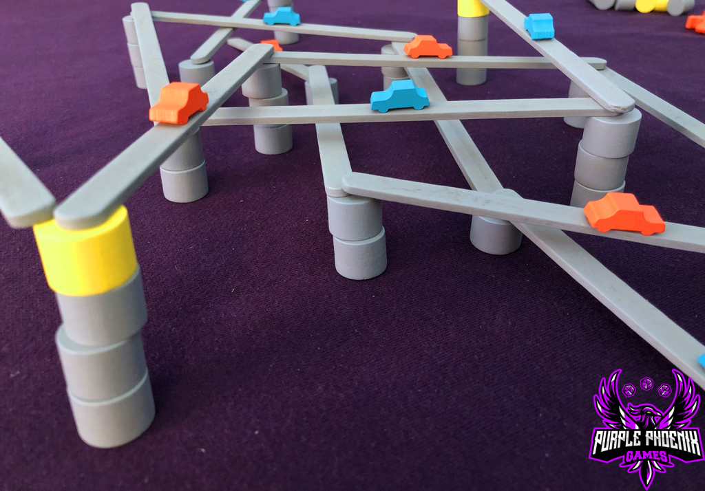 On your turn, you will perform 3 actions: build a column, build a road, and place a car. When building a column, there are 2 things to remember - the column must create a continuation of your existing road, and it must be built exactly 1 level above or 1 level below the column from which it is based. For example, to play off of a column with a height of 2, you must either play a height of 1 or a height of 3. To build a road, take one of your road sticks and place it on the columns so it connects the newly built column to its predecessor. The last part of your turn is to place a car on your road stick, if you have met the placement requirements. The requirements for placing a car are that your new section of road must cross an opponent’s road, either by being the first road to cross over it, or being the first road to cross under it. You may place additional cars on your road stick for additional roads that your segment crosses above/below.