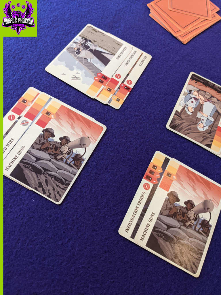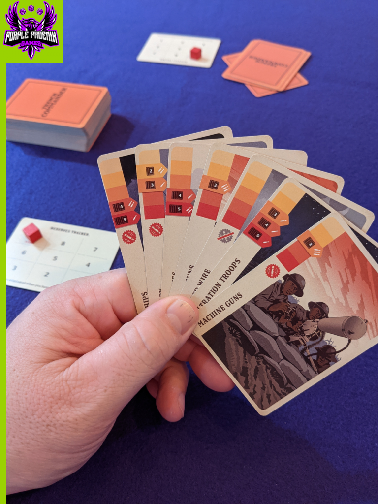 A game can look and feel great, but if it doesn’t play well, then it won’t be making it to my collection. With Trench Commander I found my games to be super quick, even with more players, because most things occur simultaneously. Several battles can be resolved at once, or the group may choose to witness each battle individually. When players are comfortable with the rules, then this game can fly, and that’s a GREAT thing. This is a light card game with opportunities for some tough tough decisions. Each player has a hand of seven cards and only plays two total each round. So players have the ability to control how many whistles they contribute to the skirmishes, or how many offsets are used to either delay battles or decrease the number of Reserves to deplete.