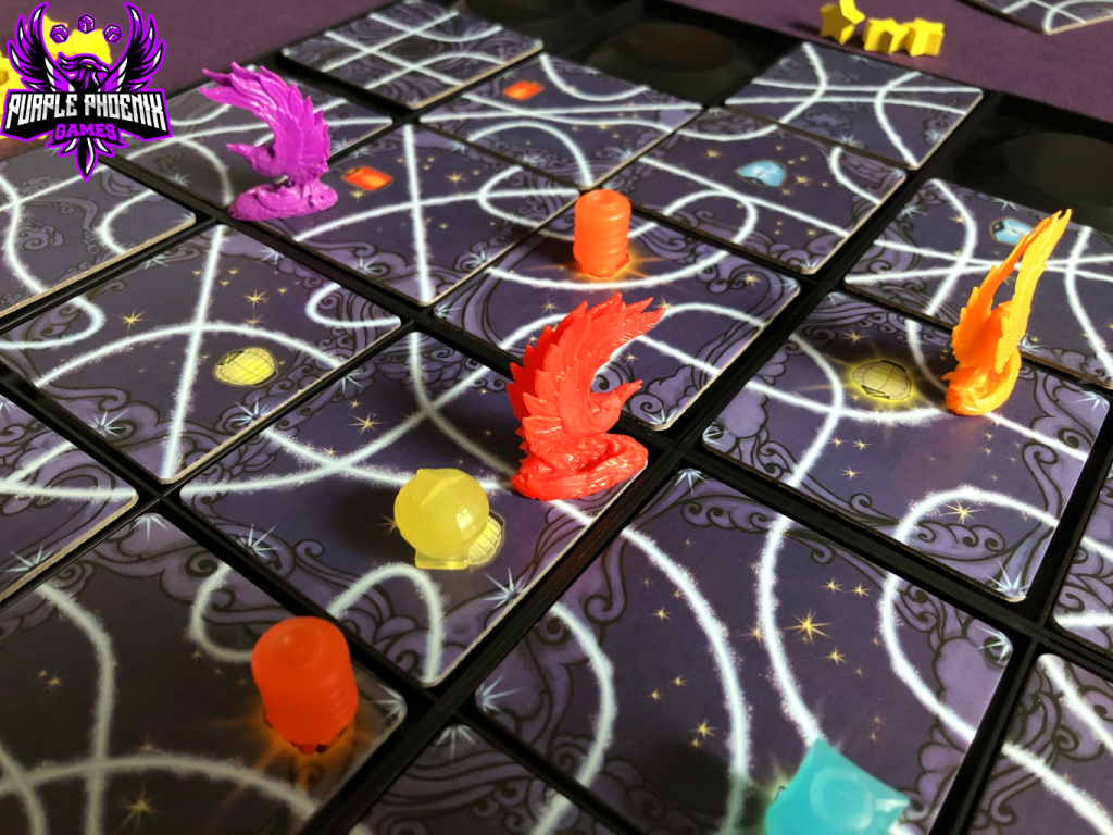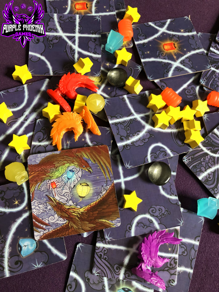 Let’s touch on components for a minute. They are pretty stellar in this game. The board is nice and sturdy, the cardboard tiles are thick, the Stars and Lanterns are of excellent quality, and the Phoenix pawns are nicely detailed and just plain fun to look at. No complaints about components from me in this game!