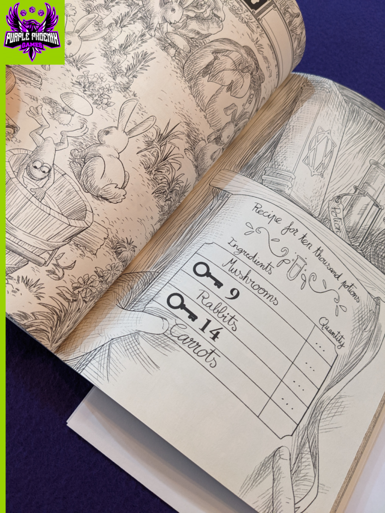 Components. This is a paperback book with a nice matte cover and black and white art within. The art is all nicely illustrated and the superfluous portions usually do not interfere with the puzzle components, as shown below. I only have one comment on the components, and that is simply that I wish the art pages featured full-color illustrations, but I know that increases production costs, and I understand the decision to withhold.