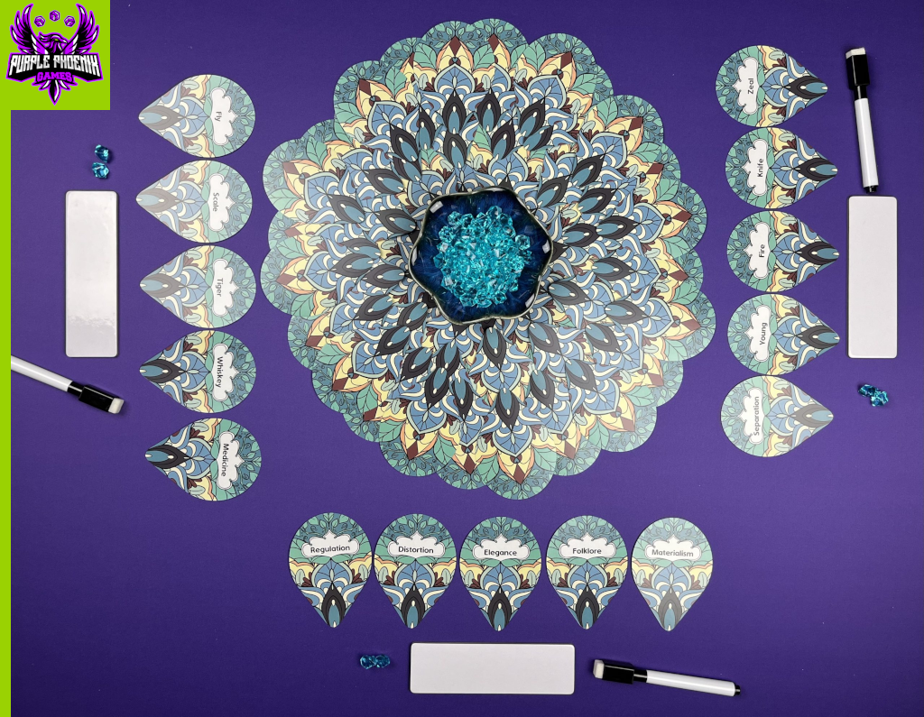 Words of a Feather is a word-based party game in which players are attempting to score points by correctly guessing words based on clues given by their opponents. Think Hues & Cues, but with words instead of colors! To setup for a game, give each player a whiteboard, marker, and 2 Gems. Shuffle the deck of cards and deal 5 to each player as well, to be placed face-up on the table. Using the remaining cards, create 4 circles of cards in the center of the table, and place the bowl with the rest of the Gems in the middle. Select a starting player, and the game is ready to begin! Pictured below is the setup for a 3-player game.