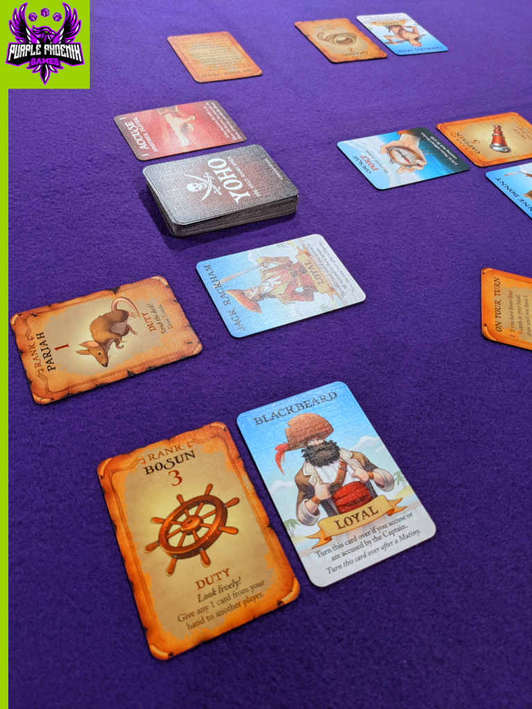 To setup players will choose their pirate persona and place it in front of them with the Loyal side showing. On the backside is the Rebel side, which will allow the player special abilities later in the game. A Captain is chosen and that player then doles out the remaining ranks of pirate jobs to the other players. Each player will be dealt five cards from the shuffled Blame deck (draw deck) for their starting hands. The top card from the deck is flipped to become the Blame Pile (discards). The Captain takes the Course card and places it Port side up. The game may now begin!