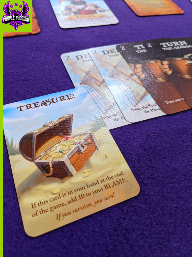 The active player’s turn will be comprised of four steps. The first step is refilling the hand to five cards. Should the player have more than five then no additional cards are drawn. Next the player will choose one card from hand to play to the Blame Pile. The card may not contain the same text as the card below it, so no stacking UNO Draw 2s. Once the card is played to the Blame Pile the active player will carry out the card’s instructions. These could be switching hands with other players, flipping their pirate cards to Rebel or vice versa to Loyal, Demoting pirate ranks, or one of the other four actions printed on the cards. Finally the active player passes the Course card to the next player to take their turn.